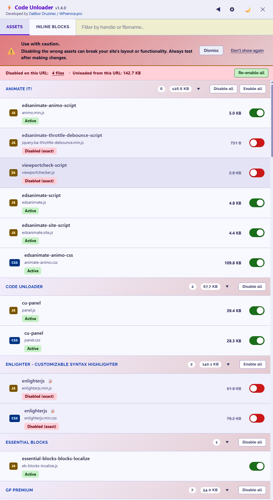 Note: It’s recommended to test changes on a staging environment before applying them to a live site. Unloading the wrong assets can break your site’s appearance or functionality.