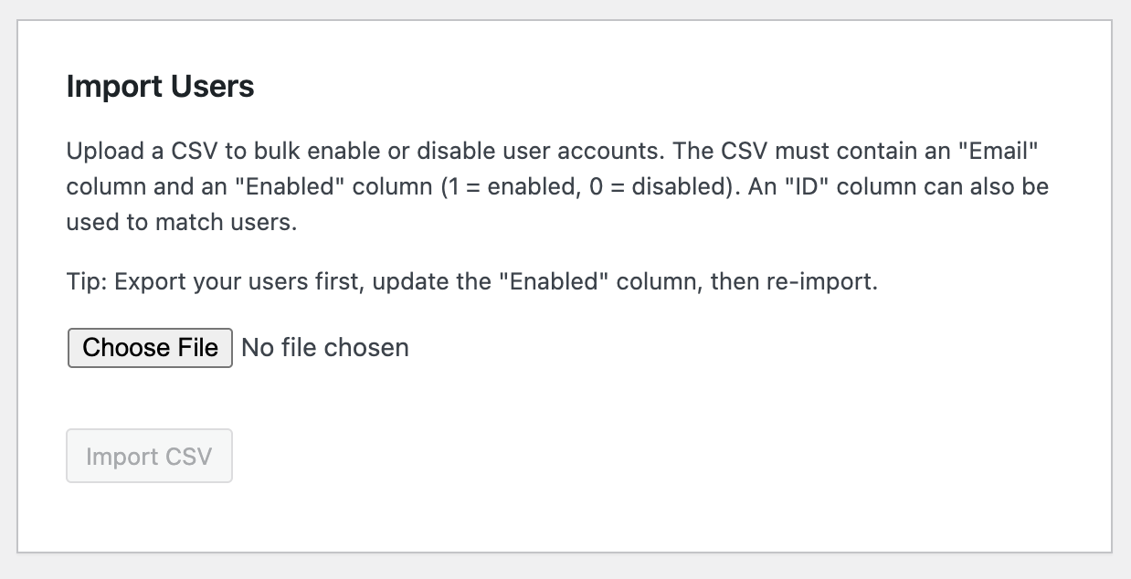 • CSV Import & Export — bulk enable or disable hundreds of users at once via spreadsheet