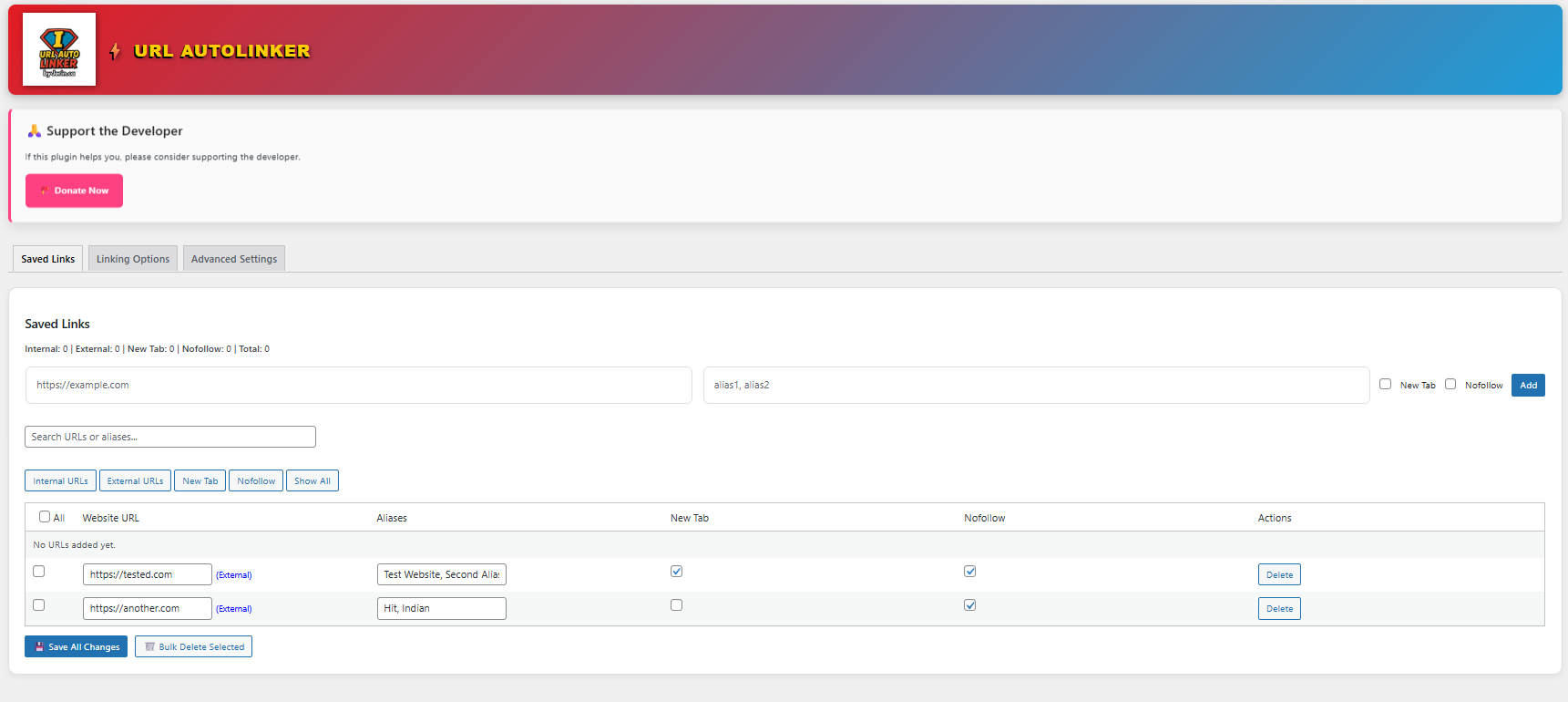 - Add your URLs and aliases, choose link options (new tab / nofollow), and save.