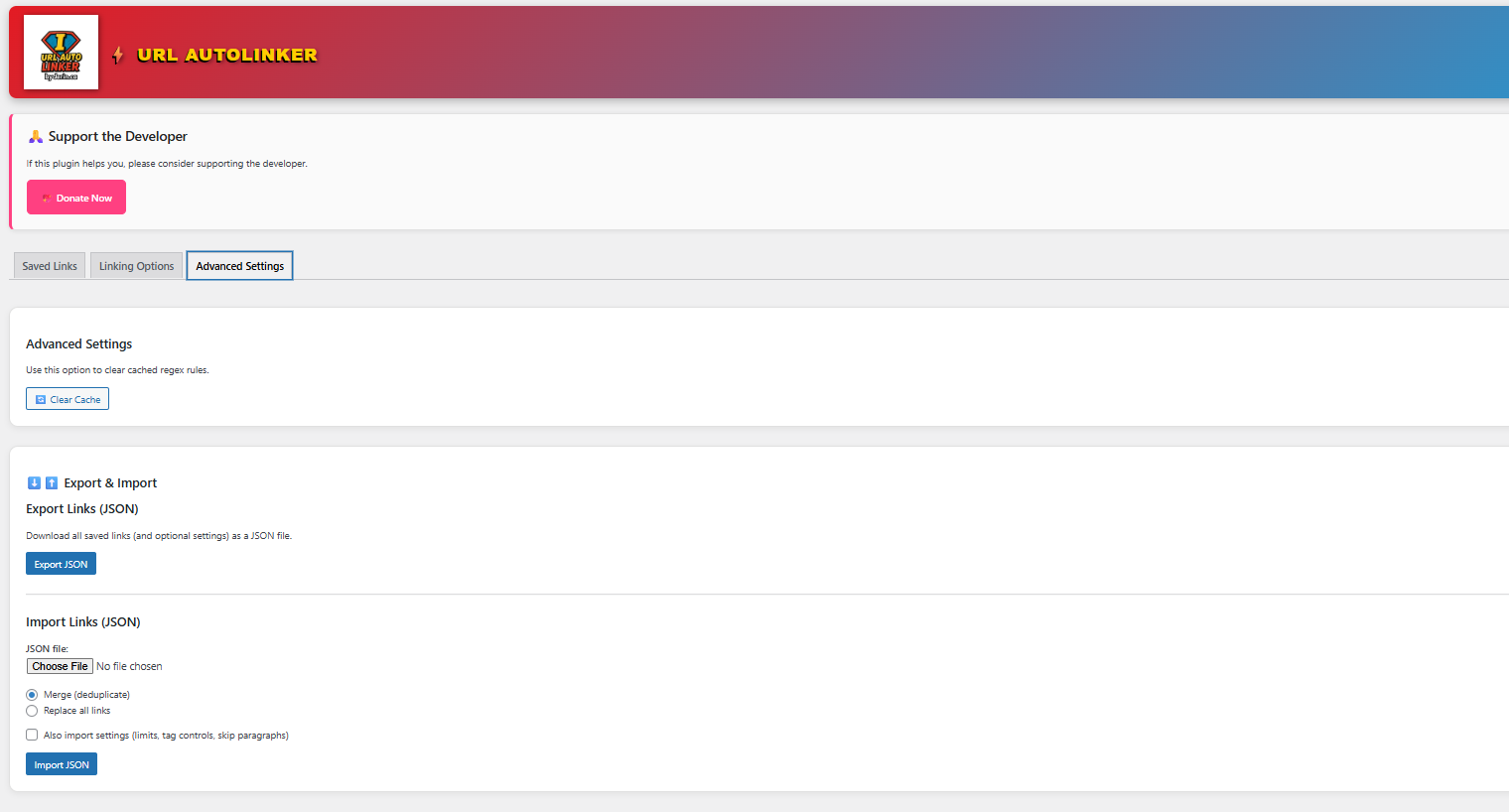 Each saved URL can have its own link behavior (open in a new tab, nofollow), and you can export/import your Saved URLs to move rules between sites.
